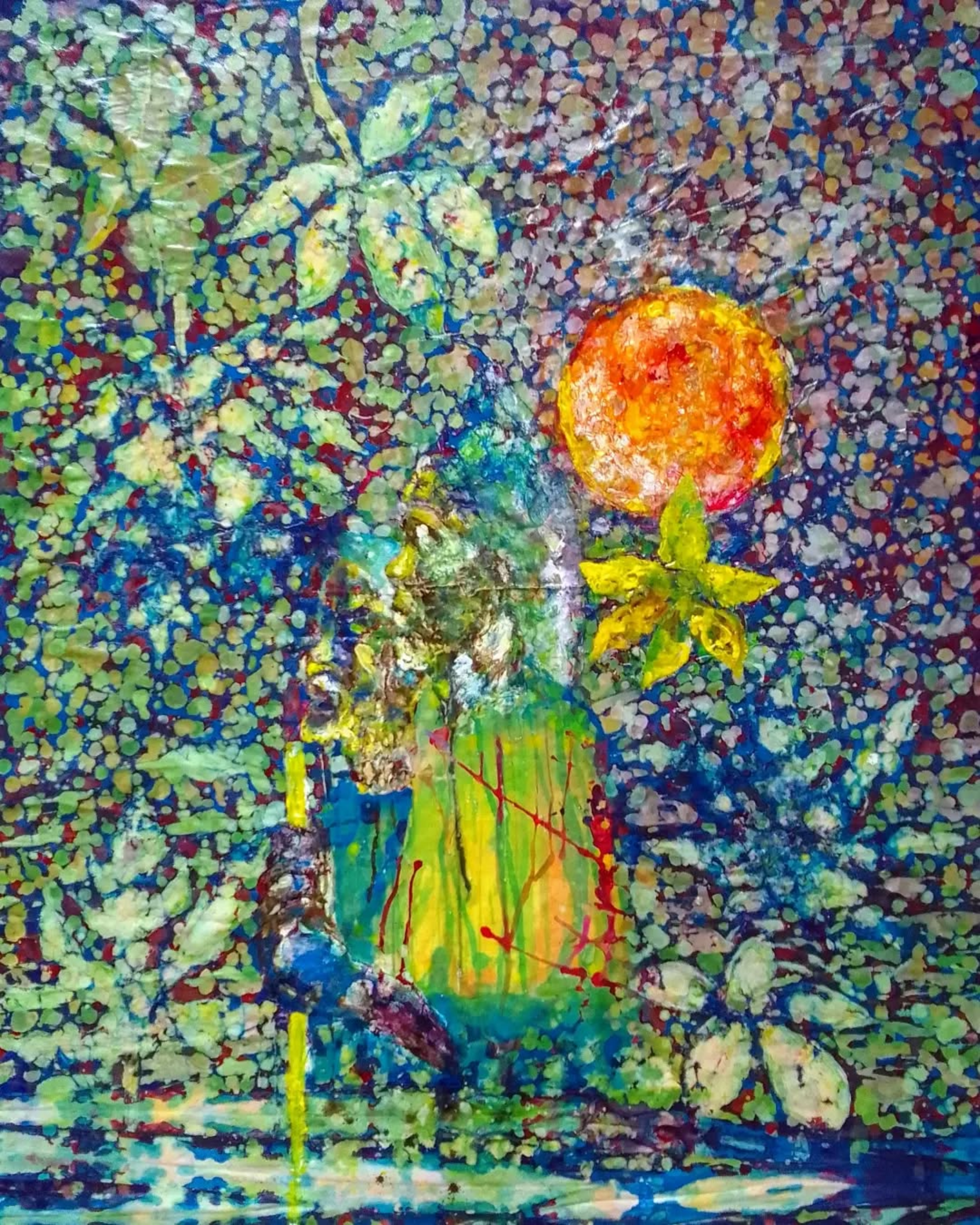Ces confettis, Drissa Yalcouyé, dont le travail a inspiré cette exposition, en fait la marque de sa peinture. Il revisite le dripping à l’Africaine : la traditionnelle technique du Batik et du pointillisme devient post-Jackson Pollonienne, post-impressionniste aussi. L’objectif est de marier différemment les couleurs, et d’illuminer la toile, à la fois parce qu’elle semble devenir transparente par endroits, et parce que la lumière se diffracte par ce procédé. Ses portraits sont lumineux, évanescents, vrais. Sans sourires, le plus souvent. Ce sont des portraits de famille, des souvenirs partagés, un réel transmué en Paradis perdu, ou préservé, selon que vous verrez le verre plein ou vide.